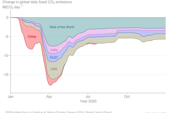 Die Verteilung des Rückgangs der CO2-Emissionen zeigt die Grafik des Global carbon projekts. Sie zeigt eindrucksvoll, dass es seit Mai keinen Rückgang der CO2-Emissionen in China mehr gegeben hat.