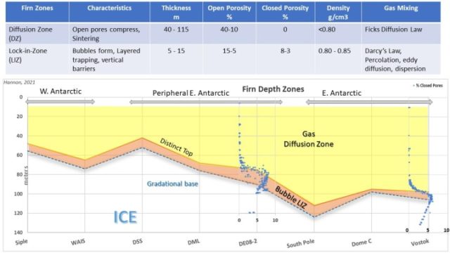 Abbildung 1 ist eine Illustration des Übergangs von Law Dome Firn zu Eis und der Dichte- und Porositätseigenschaften. Die Diffusionszone DZ, in welcher die Sinterung (Verdichtung zu einem Feststoff ohne Schmelzen) stattfindet, dauert an, bis die Dichte etwa 0,8 g/cm³ und die offene Porosität etwa 10 % beträgt. Offene Poren dienen vor allem als Kanäle, durch die Gasdiffusion und vertikale Vermischung mit atmosphärischen Gasen stattfinden kann.