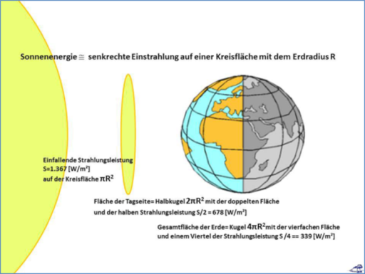 Zum besseren Verständnis können Sie einmal die Perspektive eines Satelliten einnehmen: Die planare solare Einstrahlung erfolgt auf einer Kreisfläche (PIR²) und die jeweiligen Messwerte beziehen sich auf Schnittpunkte solcher Einstrahlungsflächen mit der entsprechenden Satellitenbahn (@4PIR²). Die Satellitenmesswerte für die Solarkonstante können die Erdkrümmung also gar nicht abbilden.