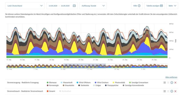 Abbildung 2: Realisierte Erzeugungsleistung und tatsächlicher Stromverbrauch im Zeitraum 14.-25. September 2020 (Quelle: SMARD)