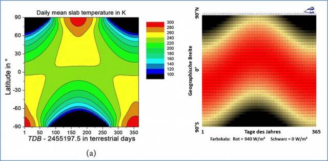 Abbildung 8: Vergleich der „Daily mean values of (a) slab temperature” von Kramm et al. (2017) – Creative Commons License CC BY 4.0 (links) mit dem Jahresverlauf des örtlichen Maximums der breitenabhängigen temperaturwirksamen spezifischen Strahlungsleistung der Sonne (rechts)