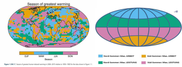 Anmerkung: Die jeweils zweistufige Farbskala für die Sommerhemisphäre in der Abb. links (Beispiel MAM und JJA für den Nordsommer) wurde im rechten Bild willkürlich in zwei einstufige Skalen für LEISTUNG (~JJA) und ARBEIT (~MAM) auf der jeweiligen Sommerhemisphäre aufgespalten und (nicht flächentreu) der tatsächlichen geographischen Lage zugeordnet. Deshalb können Farbsignaturen für Leistung/Arbeit (~JJA/MAM) in der jeweiligen geographischen Lage auch in umgekehrter Signatur (~MAM/JJA) auftreten; beispielsweise blau für LEISTUNG zwischen Äquator und mittleren Breiten.