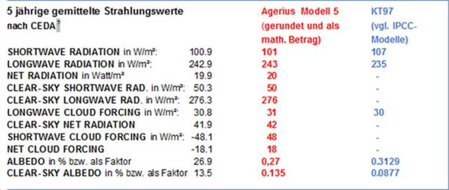 Das IPCC-Modell KT97 gilt als Grundlage für alle computergestützten Klimamodelle. Herr Albert (Aulus) Agerius hatte auf Grundlage meines hemisphärischen Strahlungsmodells ein alternatives Klimamodell erstellt. In seinem Buch „Kritische Analyse zur globalen Klimatheorie: Widerlegung der Basisstudie KT97 des IPCC mit den Messwerten des ERBS Satelliten an einem neuen Modell“ deckt er erhebliche Widersprüche in der IPCC-Basisstudie KT97 auf: