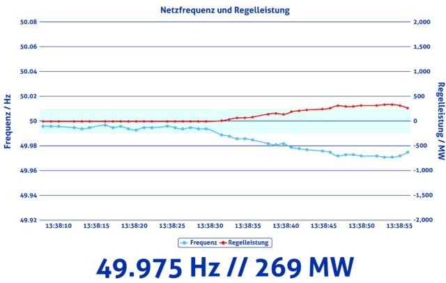 „In jedem Moment wird im Verbundnetz genauso viel Elektroenergie erzeugt, wie alle Verbraucher gerade benötigen.“ ————Es mag ja sein, dass man mit einer derartigen Formulierung auch technisch weniger Begab-te erreicht. Wenn man aber dem politischen Missbrauch durch das EEG die Stirn bieten will, ist eine saubere Terminologie sicher hilfreich. Also:————1. Die Leistungsgröße zwischen Generatoren, die eine eingeprägte Spannung liefern (die Elektrotechnik nennt den Charakter dieser Generatoren „Konstantspannungscharakteristik“, auch wenn die erzeugte Spannung eine 50 Hz Wechselspannung ist) und den angeschalteten Verbraucher bestimmen einzig und allein die Verbraucher. Das gilt dann auch für die zwischen Generatoren und den Verbrauchern über das Netz ausgetauschte Energie.————2. Sinkt die Leistungsgröße durch weniger Verbraucher, führt dies zu steigender Frequenz, die rotierenden Generatoren laufen bei gleicher Antriebsleistung schneller. Bei steigender Leistungsgröße durch die Verbraucher werden die Generatoren gebremst, die Frequenz fällt.————3. Seit dem Aufbau des Verbundnetzes und einer sicheren elektrischen Versorgung haben die Kraftwerks- und Netzbetreiber hochwirksame Strategien entwickelt, die sich ergebenden Tagesprofile in ihren Steuerungsstrategien für die bereit zu stellende Generator-Antriebsleistung prognostisch umzusetzen und entsprechend auf die Frequenzänderungen mit Leistungserhöhung oder Erniedrigung für die Generator-Antriebe stabilisierend einzugreifen.————4. Wind und Sonne für die alternativen Generatoren lassen sich nicht steuern, sie verhalten sich chaotisch in kleinen wie in großen Zeitbereichen.————5. Der Leistungsbeitrag über Wind und Sonne hingegen lässt sich im Sekundenbereich steuern oder gar abschalten, thermische Kraftwerke benötigen dazu viele Minuten bis Stunden.————6. Es ist nicht die Trägheit der thermischen Kraftwerke, die stört, sondern die unvorhersagbare Vergrößerung oder Verkleinerung der Leistung volatiler Wind- und Solar basierter Quellen.————7. Das EEG ist ein Pakt mit Politik treuen Investoren, nicht die schnell steuerbaren volatilen Quellen zur Regelung heran zu ziehen, sondern im Ausland nach Verbrauchern zu suchen, die über zusätzliche Lasten die Frequenz wieder in den zulässigen Bereich führen. Damit das gelingt, wird die Energie verschenkt und die Abnehmer dafür auch noch bezahlt. Es wird unter Irrtumserregung verbreitet, dass dies aus technischen Gründen nicht anders geht. Das ist alles andere als nachhaltig.————8. Kein normaler Mensch würde den ganzen Tag Wasser laufen lassen, nur damit das Wasserwerk mehr Umsatz macht.————9. Zusammengefasst: Wenn der Eingangssatz richtig wäre, bliebe die Frequenz immer genau bei 50,000 Hz und würde nie davon abweichen. Fällt die Frequenz, wird eben nicht diejenige Energie erzeugt, die die Verbraucher abnehmen würden, wenn die Frequenz 50,000 Hz wäre.————10. Eine Trennung von dem zur Vorteilsnahme nur weniger Investoren geschaffenen EEG mit Eingriff in die volatilen Energiespender, indem man eben nicht gerade die Energie abnimmt, die sie im Moment liefern „könnten“, würde die Blackout-Gefahr dadurch mindern, dass auch Politiker davon ablassen, erprobte Kraftwerke aus ideologischen Gründen in die Luft zu sprengen oder sonst irgendwie still setzen.