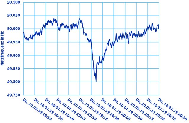 Bild 6: Am 10. Januar 2019 kam es im europäischen Verbundnetz aus Ursachen, die immer noch nicht vollständig geklärt sind, zu einem plötzlichen Abfall der Frequenz. Daraufhin wurden in Frankreich industrielle Verbraucher mit einer Leistung von 1,5 Gigawatt „abgeworfen“. Wäre dies nicht erfolgreich gewesen, hätte es eine weitere Kaskade von Abwürfen gegeben. (Quelle: www.netzfrequenzmessung.de)