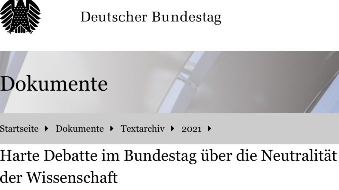 Daher nahm die Schwefelpartei (Klonowski), bzw. deren Bundestagsfraktion den Ball auf und beantragte, und bekam sie bewilligt, eine aktuelle Stunde zum Thema „Neutralität der Wissenschaft bewahren – Politischen Druck auf Forschungsinstitute verhindern“. Die Webseite des Bundestages berichtete anschließend kühl darüber (hier) :“ Die Debatte war von gegenseitigen Vorwürfen geprägt, der Ton unfreundlich, teilweise feindlich.“