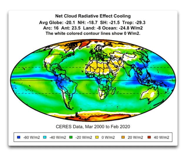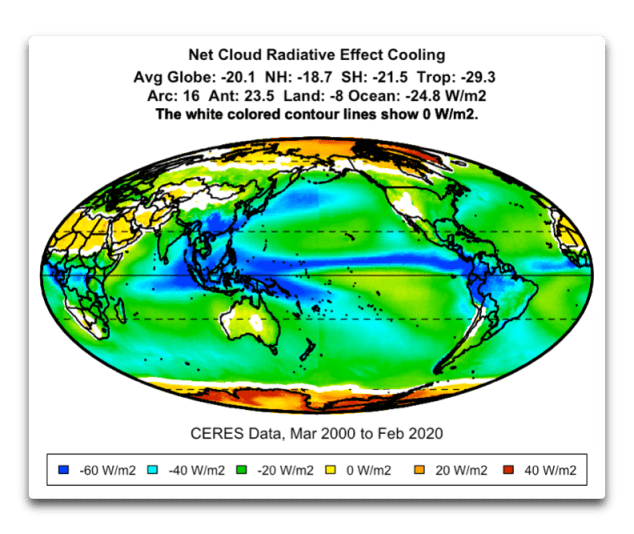 Man beachte die starke Abkühlung entlang der innertropischen Konvergenzzone (ITCZ) über dem Äquator und im pazifischen Warmpool nördlich von Australien. Dort sorgen die Wolken für eine Abkühlung von bis zu sechzig Watt pro Quadratmeter (W/m²). Zum Vergleich: Eine Verdoppelung des CO2 soll die Erwärmung um 3,5 W/m² erhöhen, eine Größenordnung weniger …