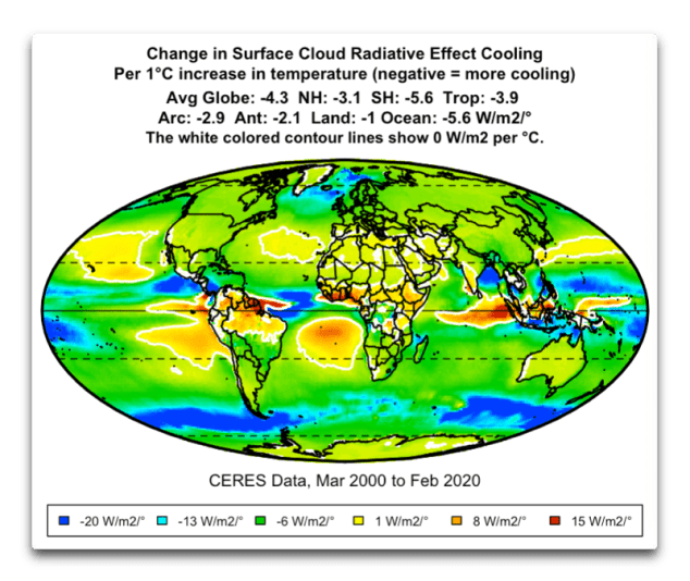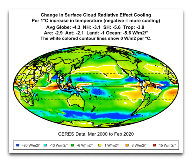 Abbildung 3. Änderung des Netto-Wolkenstrahlungseffekts (LW-Erwärmung minus SW-Abkühlung) pro ein Grad C Oberflächenerwärmung. Negative Werte zeigen an, dass es eine größere Wolkenabkühlung mit steigender Oberflächentemperatur gibt.
